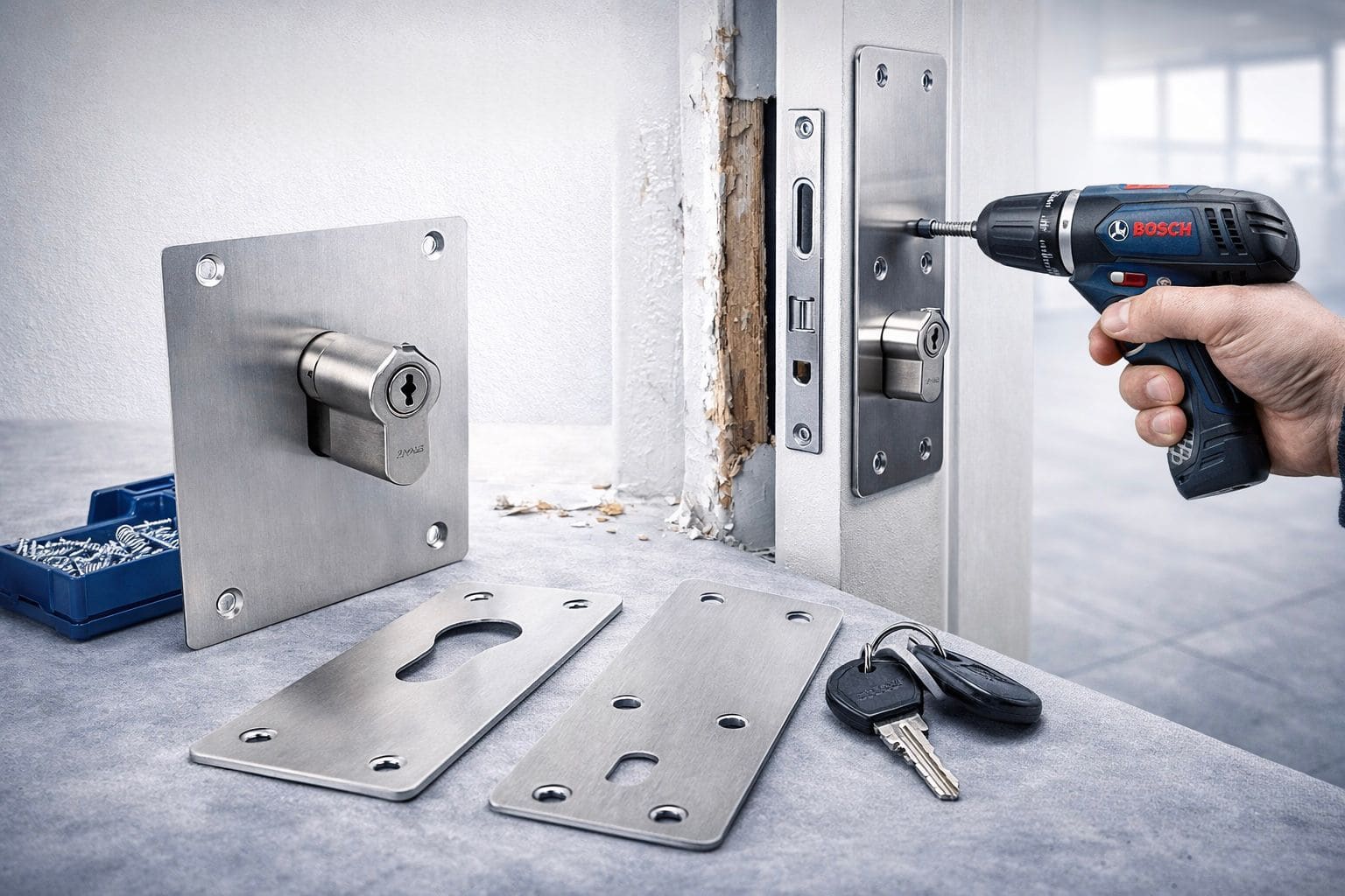 Reparaturbleche sind die schnelle Lösung zur Sicherung beschädigter Türen nach Einbruch oder Verschleiß. Unser Schlüsseldienst verstärkt geschwächte Bereiche effektiv, erhöht den Einbruchschutz und sorgt dafür, dass Ihre Tür wieder stabil und sicher funktioniert